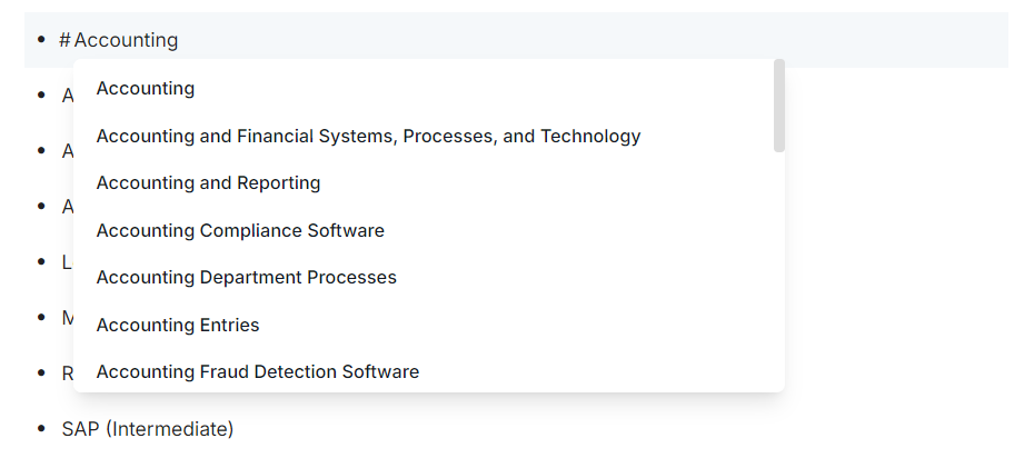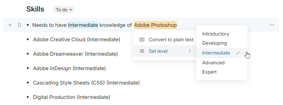 For competencies, education, skills, certifications, and languages, you can further define job requirements by specifying the level. If the sentence already names that level e.g., ‘Needs to have Intermediate knowledge of…’ we highlight ‘Intermediate’ in blue. If not, we add the level in brackets after the item e.g., ‘Needs to have knowledge of Adobe Photoshop (Intermediate)’.
