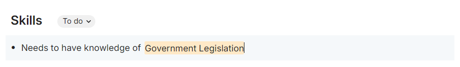 When you click on a line, you’ll see library items highlighted in orange. The remaining text is descriptive. For example, you might want to say “Needs to have knowledge of…”. That part of the sentence is not content from your library. It is only text that appears on the job description.