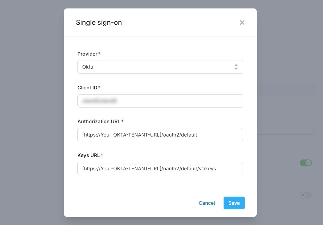 Single sign-on allows users to access Quinto with their Okta credentials using a public key handshake method.
